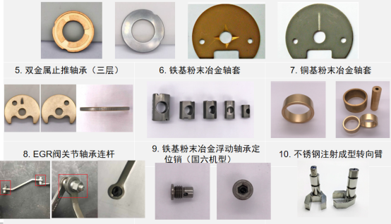 長沙波德冶金材料有限公司主要產品包括止推軸承、浮動軸承支撐套、止推軸承擋板、止推墊片、含油軸承等,主要應用車用、船用、坦克和步兵戰車等三大應用方向的渦輪增壓器粉末冶金軸承和黃銅合金軸承上。如下圖所示: