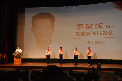 ????2017年7月6日下午,公司黨委組織人員參加在市人民劇場舉行的廖俊波同志先進事跡報告會。會上,南平市委常委、組織部部長羅志堅、政和縣人大常委會主任鄭滿生、政和縣石屯鎮(zhèn)松源村支書袁云機、閩北日報記者黃旭輝先后作了題為《牢記使命 不負黨恩》、《向夢想前進》、《廖書記,我們想你》和《遺憾與無憾》的報告。廖俊波同志的妻子林莉則以視頻播放的形式作了題為《一諾無悔》的報告。