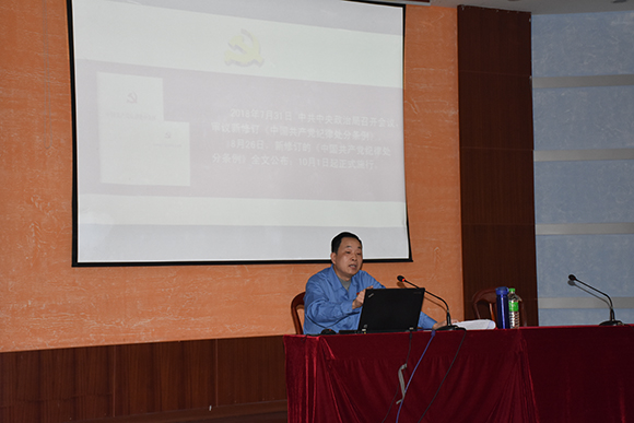 ????2019年11月13日下午,公司紀委書記鄭建成在公司俱樂部講授《全面從嚴治黨的紀律保障》專題黨課,公司領導、各黨總支(黨支部)書記、中層干部及主題教育領導小組辦公室成員聆聽學習。鄭建成首先指出,2018版《紀律處分條例》是全面貫徹習近平新時代中國特色社會主義思想和黨的十九大精神,以黨章為根本遵循,把黨章和《關于新形勢下黨內政治生活的若干準則》等黨內法規的要求細化具體化,堅持使命引領和問題導向,針對管黨治黨存在的突出問題扎緊籠子,實現制度的與時俱進,特別是作為出發點和落腳點,使全面從嚴治黨的思路、舉措更加科學、更加嚴密、更加有效。他結合云南省國有資本運營有限公司原黨委書記、董事長劉崗典型案例,舉一反三,引以為戒,重點講授《中國共產黨紀律處分條例》修訂的背景、主要內容和如何認真貫徹落實等三方面內容。