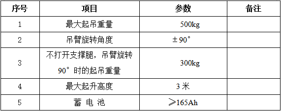 2.1.2整車電動驅(qū)動, 吊臂可旋轉(zhuǎn);在吊臂根部(吊臂不旋轉(zhuǎn))能吊500KG;兩側(cè)支撐腿不打開,吊臂旋轉(zhuǎn)90°,能吊300KG。