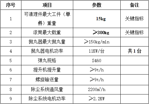 2.2功能、結構須滿足如下要求:該設備主要由吊鉤輸送系統、清理室體、拋丸器、提升機、維修平臺、分離器、螺旋輸送器、底部料斗、除塵系統、電控系統等組成。