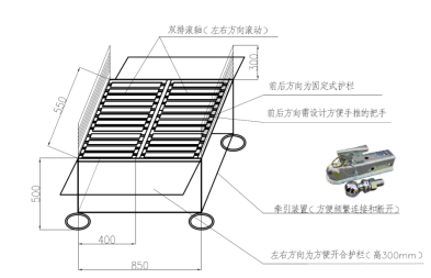* 1.44車廂臺面裝有滾軸,左右方向(牽引方向為前后方向)滾動,左右方向設(shè)計有方便開合的防護欄,方便裝卸貨。