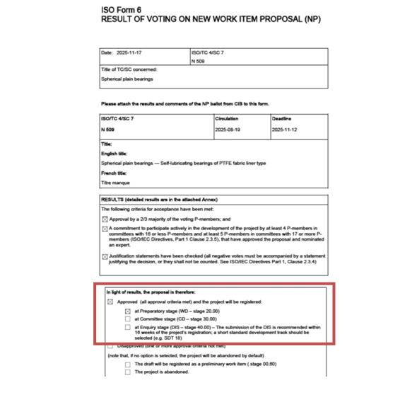 近日,由龍軸集團主導的ISO/NP 25994:Spherical plain bearings-self-lubricating bearings of PTFE fabric liner type(《關節軸承 PTFE織物襯墊型自潤滑軸承》)國際標準提案,經過ISO/TC4/SC7組織的新工作項目提案(NP)投票環節,已正式獲批立項,進入正式起草階段。這是我國牽頭立項成功的首份自潤滑軸承國際標準,同時也是全球首份針對PTFE織物襯墊型自潤滑軸承的產品標準,標志著我國在自潤滑軸承高端技術領域實現了從“技術跟隨”到“標準引領”的歷史性突破,具有里程碑的標志性意義。