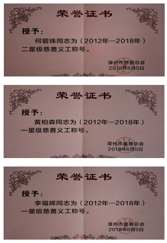 2018年6月5日,首屆漳州市星級慈善義工分隊、星級慈善義工授星儀式在漳州市慈善總會舉行,公司何碧珠同志榮獲二星級慈善義工稱號,黃柏森同志和李福輝同志榮獲一星級慈善義工稱號。公司義工分隊自2012年成立以來,圍繞“志愿、無償、友愛、互助”的服務精神,在扶貧濟困、安老扶幼、助學助醫(yī)、社區(qū)服務、慈善宣傳等方面積極開展志愿服務活動,為建設美麗、富裕、幸福漳州做出了龍軸貢獻,充分體現(xiàn)了公司做為全國文明單位在履行社會責任、推進幫扶工作的示范帶頭作用。