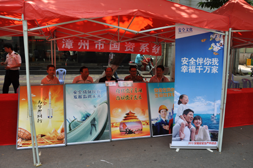 按照《漳州市人民政府安全生產(chǎn)委員會(huì)辦公室關(guān)于做好安全生產(chǎn)宣傳咨詢(xún)?nèi)栈顒?dòng)的通知》精神,6月9日早上,我公司代表國(guó)資系統(tǒng)參加漳州市2013年安全生產(chǎn)宣傳咨詢(xún)?nèi)栈顒?dòng),在市區(qū)延安北路繁華路段設(shè)置咨詢(xún)點(diǎn),舉行安全生產(chǎn)知識(shí)咨詢(xún)活動(dòng)。主要活動(dòng)內(nèi)容有:分發(fā)安全生產(chǎn)宣傳資料;安全生產(chǎn)知識(shí)咨詢(xún);謎語(yǔ)競(jìng)猜;安全月主題展等。