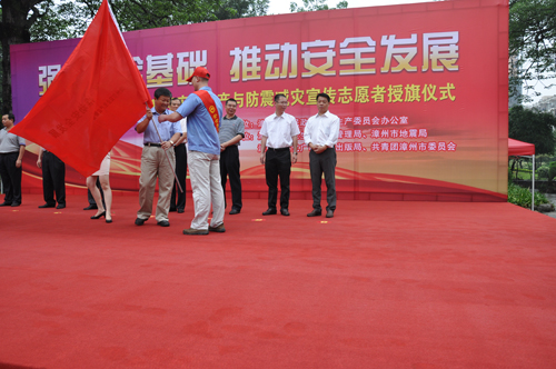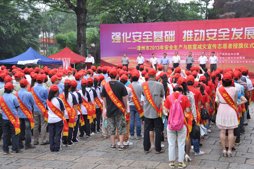 今年5月份是全市第二個(gè)防震減災(zāi)宣傳月,6月份是全國(guó)第十二個(gè)“安全生產(chǎn)月”。6月13日上午,公司黨委副書(shū)記張?zhí)┥鷰ьI(lǐng)15名安全生產(chǎn)志愿者代表國(guó)資系統(tǒng)參加漳州市2013年安全生產(chǎn)與防震減災(zāi)宣傳志愿者授旗儀式