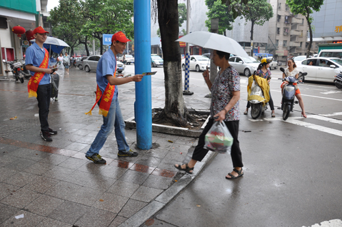 (圖a)志愿者深入到龍軸新村延安北路街頭,為過(guò)往行人分發(fā)安全生產(chǎn)宣傳資料。